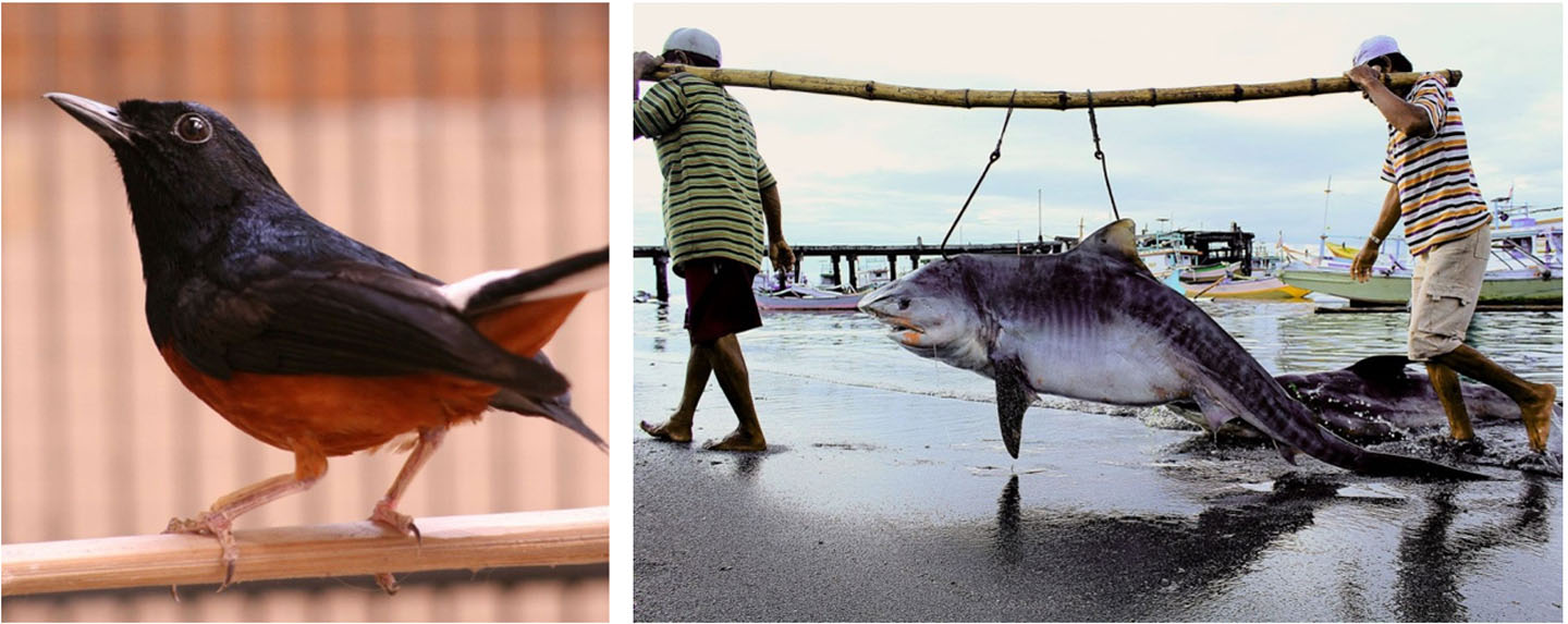 Kiri: Murai batu/ Copsychus saularis; Kanan: Hiu yang ditangkap oleh nelayan di Tanjung Luar, Lombok