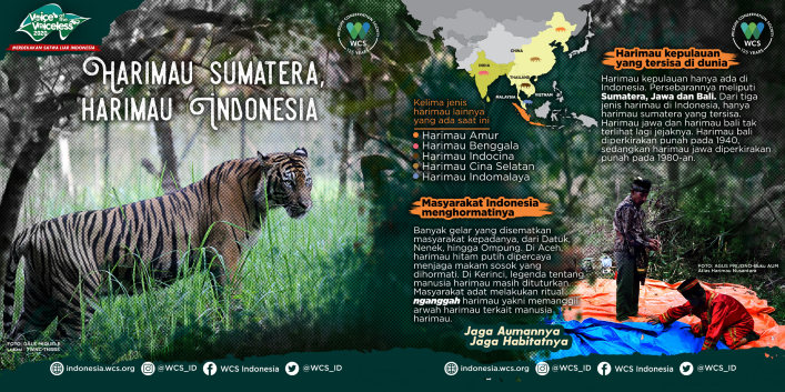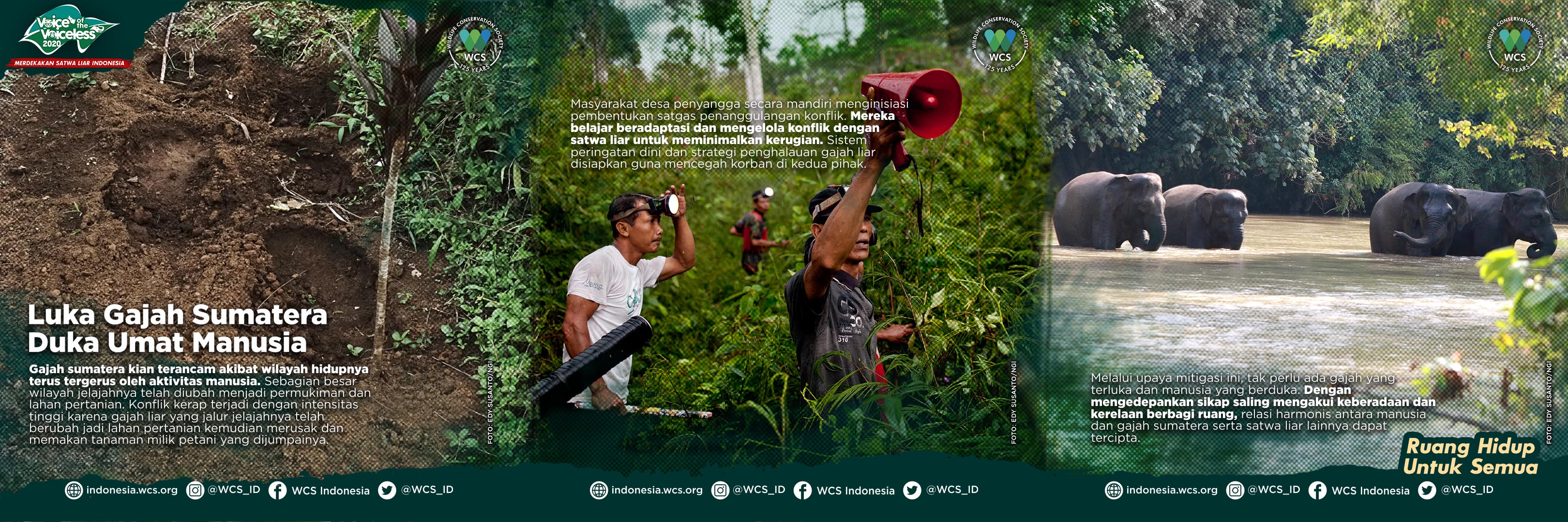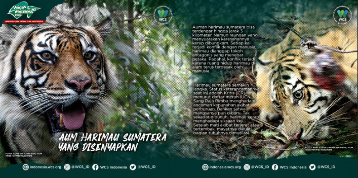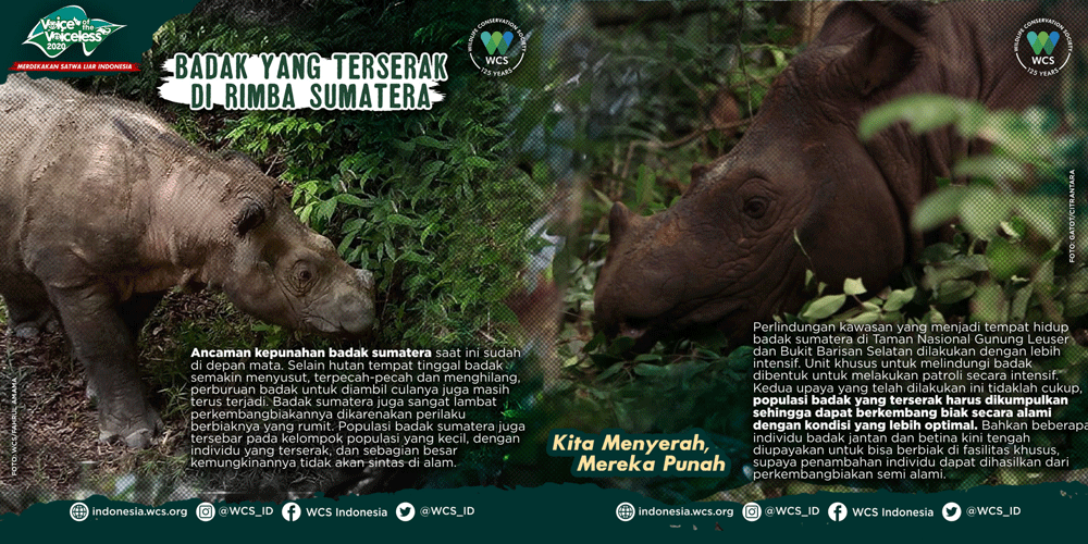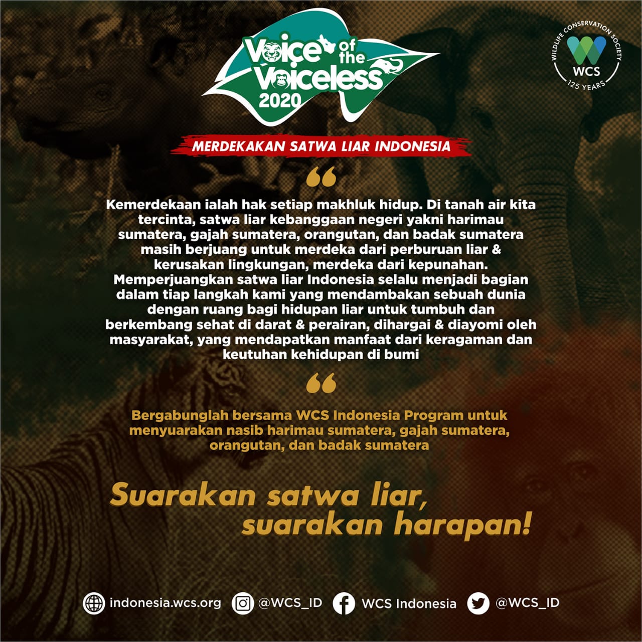 WCS Indonesia Program menginisiasi kampanye ‘Voice of the Voiceless’, yang mengajak Anda bersama-sama menyuarakan perlindungan empat spesies satwa Indonesia terancam punah melalui penggunaan teknologi dan media sosial. Menyelaraskan perayaan Global Tiger Day hingga International Rhino’s Day yang berlangsung dari 29 Juli hingga 22 September 2020, Voice of the Voiceless memanfaatkan momentum secara berkesinambungan. Seri event ini direkat dengan Hari Ulang Tahun ke-75 Kemerdekaan Republik Indonesia yang bermakna kemerdekaan untuk seluruh makhluk hidup, tak terkecuali satwa liar Indonesia. Voice of the Voiceless mengusung empat tema yang mewakili pesan kunci dari masing-masing satwa; Jaga Aumannya, Jaga Habitatnya (harimau sumatera); Ruang Hidup untuk Semua (gajah sumatera); Hutan Kita Rumah Mereka (orangutan); dan Kita Menyerah, Mereka Punah (badak sumatera).