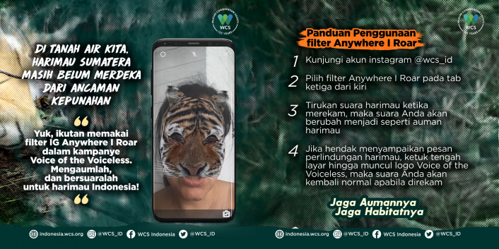 Jaga Aumannya, Jaga Habitatnya adalah tema kampanye Voice of the Voiceless seri harimau sumatera. Digital banner dan video pendek berisi konten edukatif diproduksi untuk menyampaikan informasi dasar mengenai harimau sumatera. Filter instagram Anywhere I Roar disediakan dengan menampilkan filter topeng wajah harimau, dilengkapi efek suara yang mirip auman harimau. Filter ini menjadi media bagi semua orang yang memiliki akun instagram untuk bersama-sama mengaum serta menyampaikan pesan-pesan ajakan untuk melindungi dan melestarikan harimau sumatera. Filter Anywhere I Roar tersedia di akun instagram @WCS_ID.